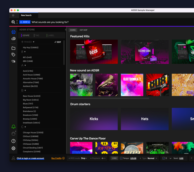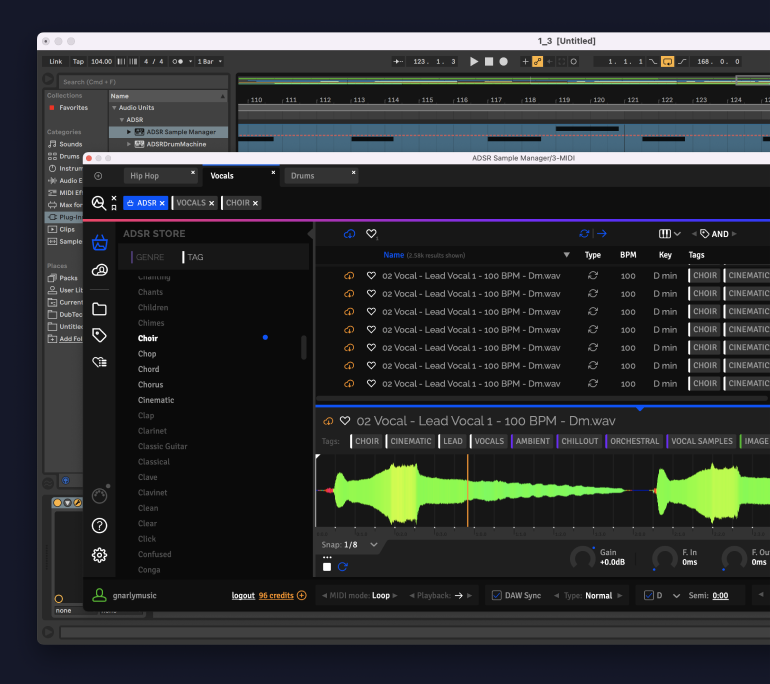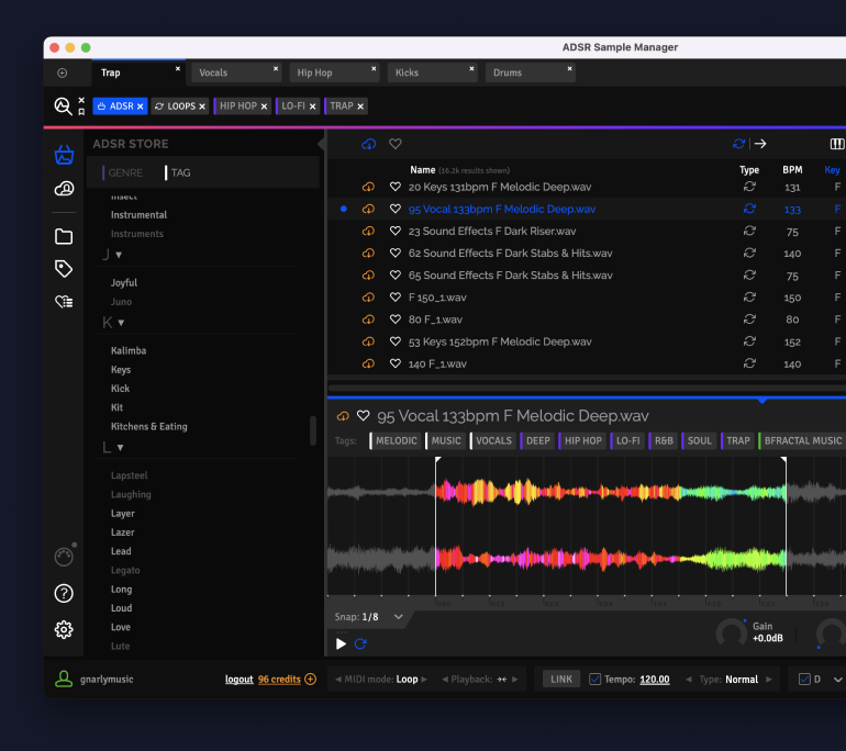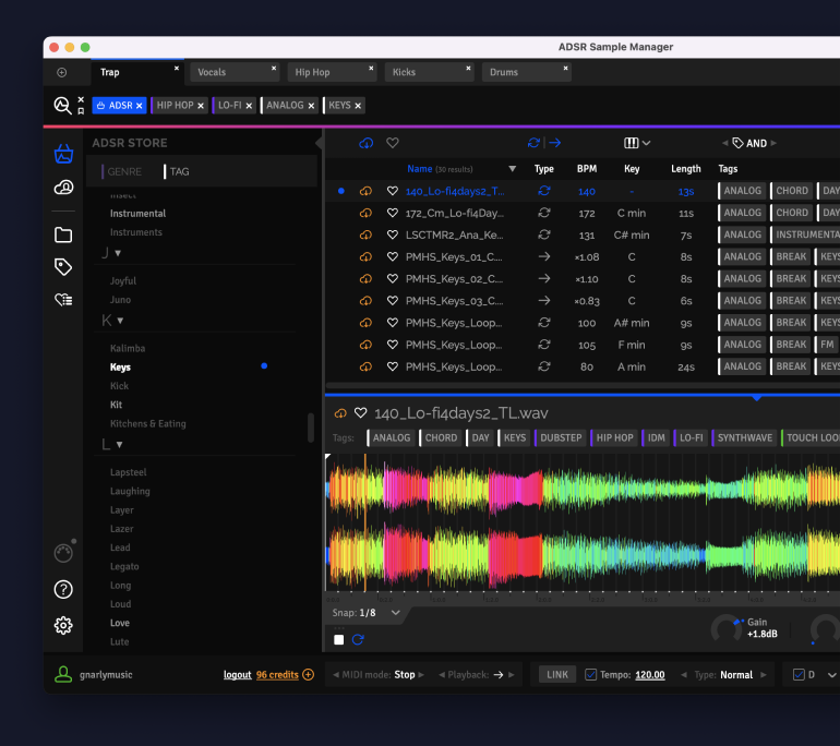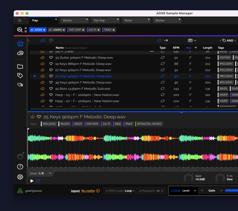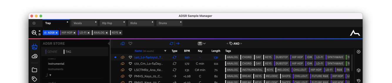 ADSR Sample Manager makes your entire sample library searchable with smart and custom tags. Preview any sample in your local library or purchased on ADSR without reorganising anything and audition them in the context of your track (BPM and/or key synced) using MIDI or drag audio directly to your project.